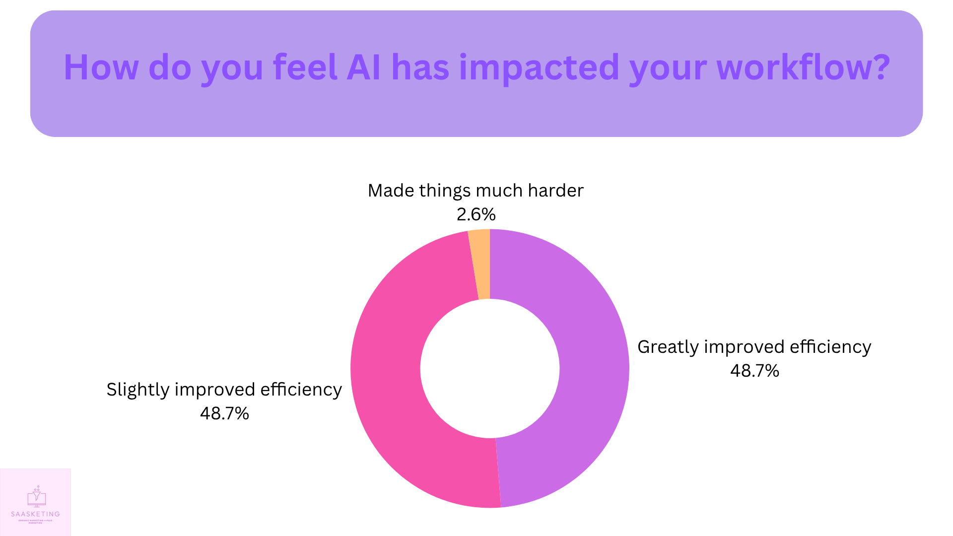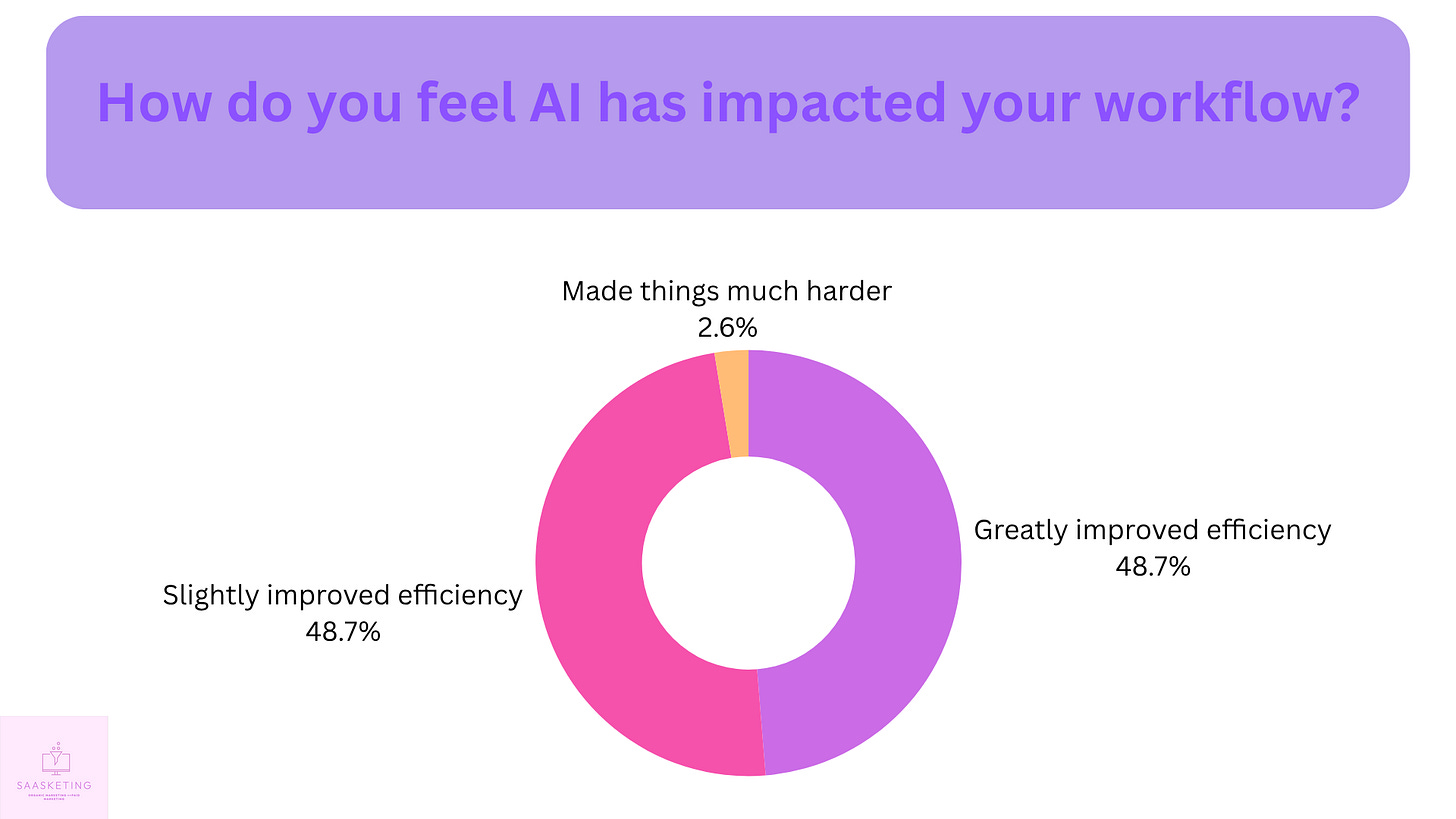 Wow, this is interesting! An equal number of respondents believe that AI has either greatly or slightly improved their efficiency. To each their own I guess? Depends on how you use AI and what do you define by “efficiency”!